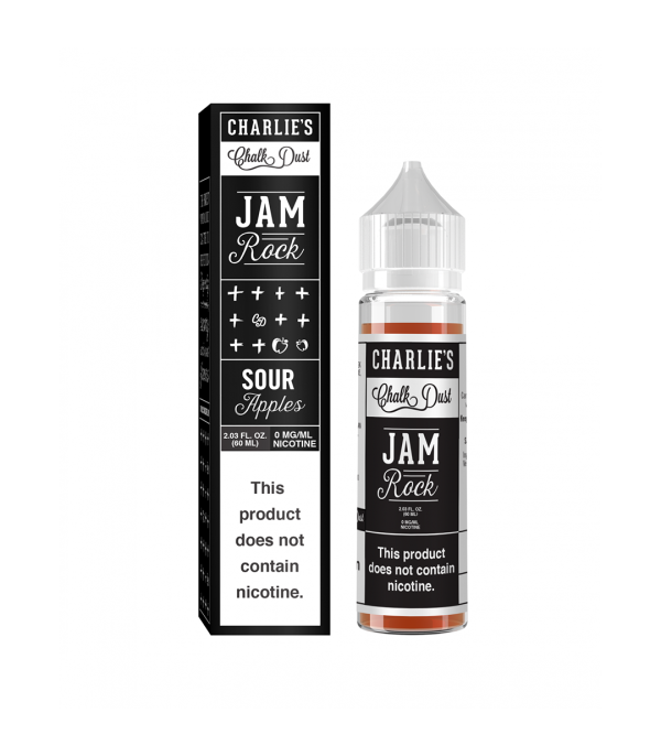 Charlie’s Chalk Dust Jam Rock, tatlı-ekşi elma şekeri aromalarını şerbetimsi dokunuşla sunan 50 ml freebase e-likittir. 60 ml şişede 0 mg olarak gelir ve 70 VG / 30 PG oranıyla yoğun buhar ve net meyve aromaları sağlar.