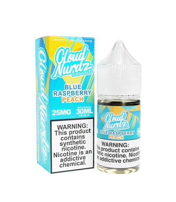 Cloud Nurdz Blue Raspberry Peach Iced Salt Likit, ekşi mavi ahududu ve tatlı şeftali aromalarını buz ferahlığıyla buluşturur. 30 mL, 25 mg / 50 mg nikotin seçenekleri, 60VG/40PG oranı.