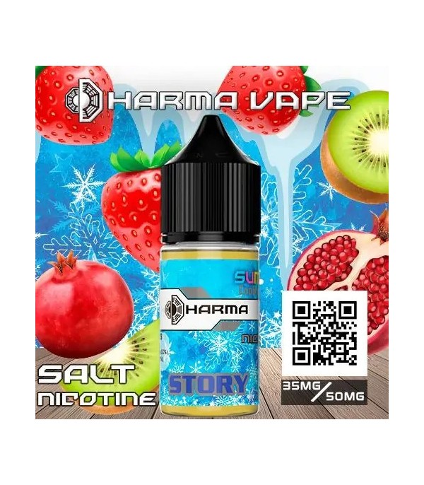 Dharma Story Salt Likit, çilek, kivi, nar ve buz süt aromalarının dengeli birleşimi ile ferahlatıcı ve yumuşak bir vaping deneyimi sunar. 30 ml şişe, 35/50 mg nikotin seçenekleri ve pod mod cihazlarla uyumlu premium formülüyle kullanıcı dostudur.