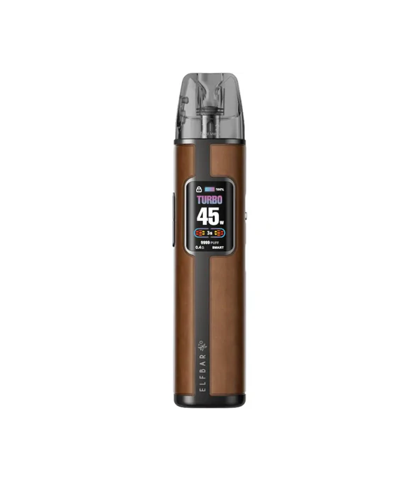 Elf Bar ELFX Pro Classic Edition Pod Mod kahverengi deri görünümlü ekranlı.