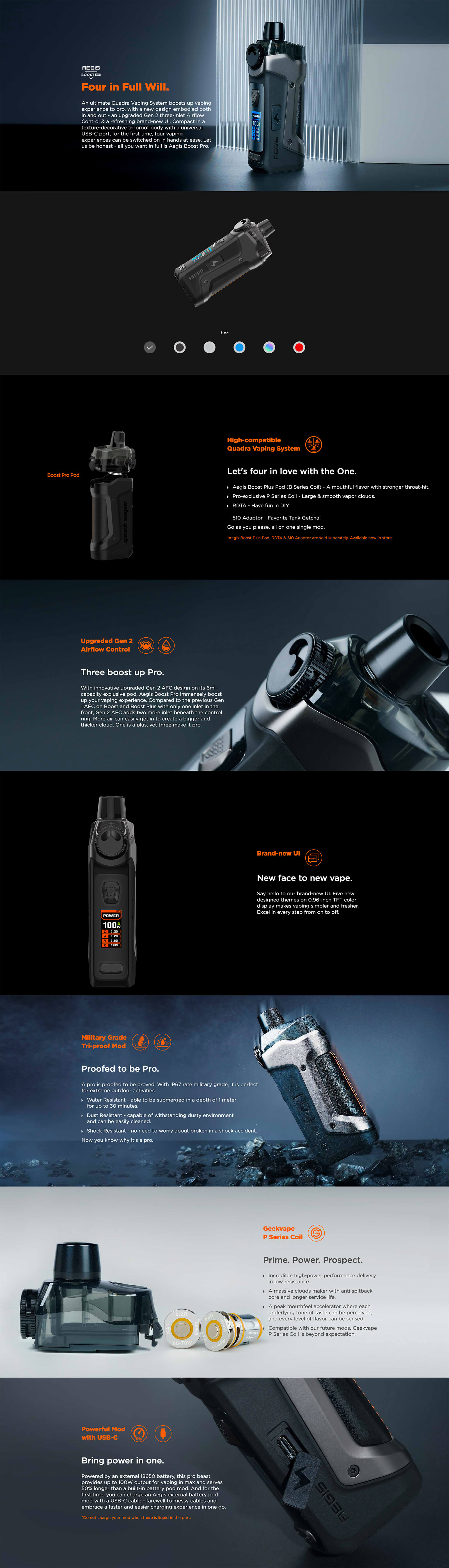 Geekvape Aegis Boost Pro Pod Mod, suya, toza ve darbeye karşı dayanıklılık sağlayan IP-67 derecesi ile zorlu koşullarda bile sağlam bir performans sunan bir pod mod cihazdır. Tek bir 18650 harici pil ile çalışır ve maksimum 100 watt çıkış gücüne ulaşabilir. Cihazın kartuşu 6 ml likit kapasitesine sahip olup, uzun süreli kullanım sağlar. Ayrıca, Aegis Boost Pro, Aegis Boost Plus Pod ile de uyumludur, bu da kullanıcıya esneklik sunar. Type-C şarj girişi sayesinde hızlı ve güvenli şarj imkanı tanır.