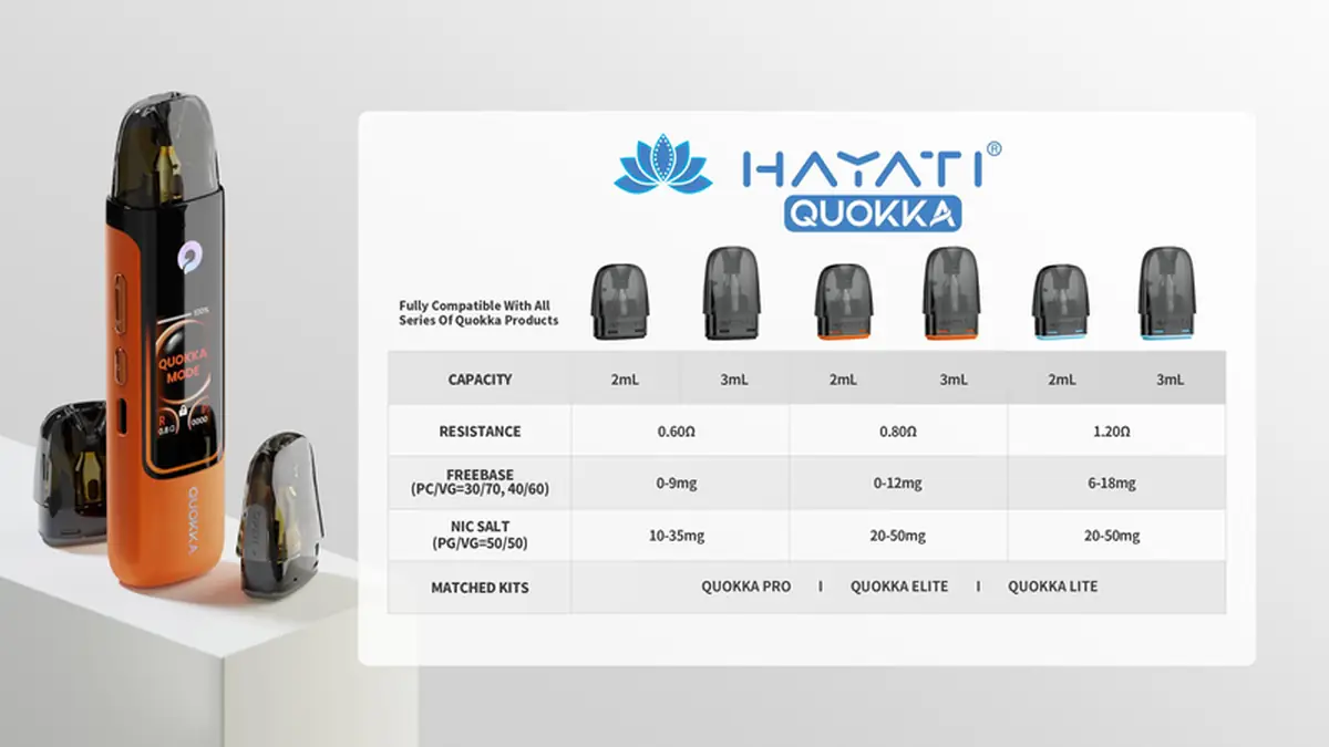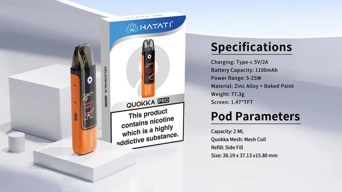 Hayati Quokka Pro Pod Kit, 1100mAh bataryası, Type-C 2A hızlı şarj desteği ve 5-25W güç aralığı ile hem aroma hem orta düzey buhar isteyen kullanıcılara hitap eder. 0.6 Ohm, 0.8 Ohm ve 1.2 Ohm pod seçenekleriyle pod tercihine bağlı içim tarzını değiştirir; interaktif LED ışık sistemi ve 1.47” TFT ekran ile görsel zevki de ön planda tutar. MTL ve RDL içimlerde performansını göstermeye uygundur.