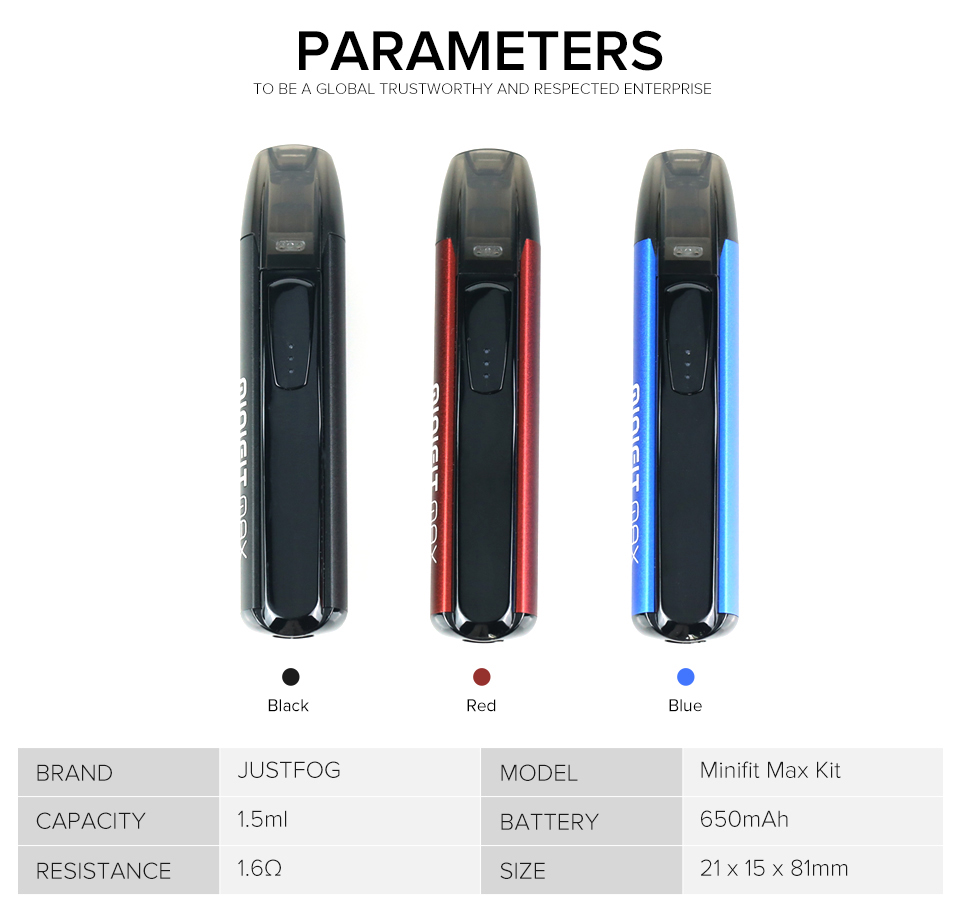 Justfog Minifit Max Pod Mod650mAh dahili bataryası sayesinde uzun süreli kullanım sunan bu cihaz, kullanıcı dostu özellikleri ve minimal tasarımıyla hem yeni başlayanlar hem de deneyimli kullanıcılar için mükemmel bir seçimdir.