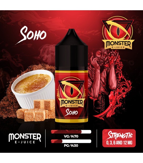 Monster serisinin klasik ve sofistike aromalarından biri olan Soho, tütünün karakterli lezzetini esmer şekerin sıcak tatlılığı ve muhallebinin yumuşak dokusuyla bir araya getirerek dengeli ve premium bir vaping deneyimi sunar.