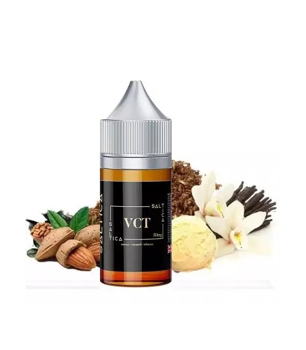 Saltica VCT Salt Likit şişe, badem, vanilya ve tütün aromalı.