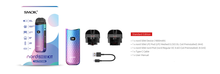 • 1 x Nord 50W Nord Pod (Nord Regular DC 0.6 Ohm Coil ile önceden yüklenmiş) (4.5ml kapasiteli)