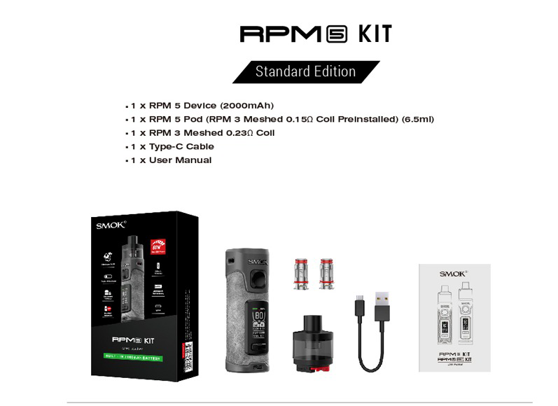 • 1 adet RPM 5 Pod (RPM 3 Meshed 0.15 Ohm Coil ile önceden yüklenmiş) (6.5ml kapasiteli)