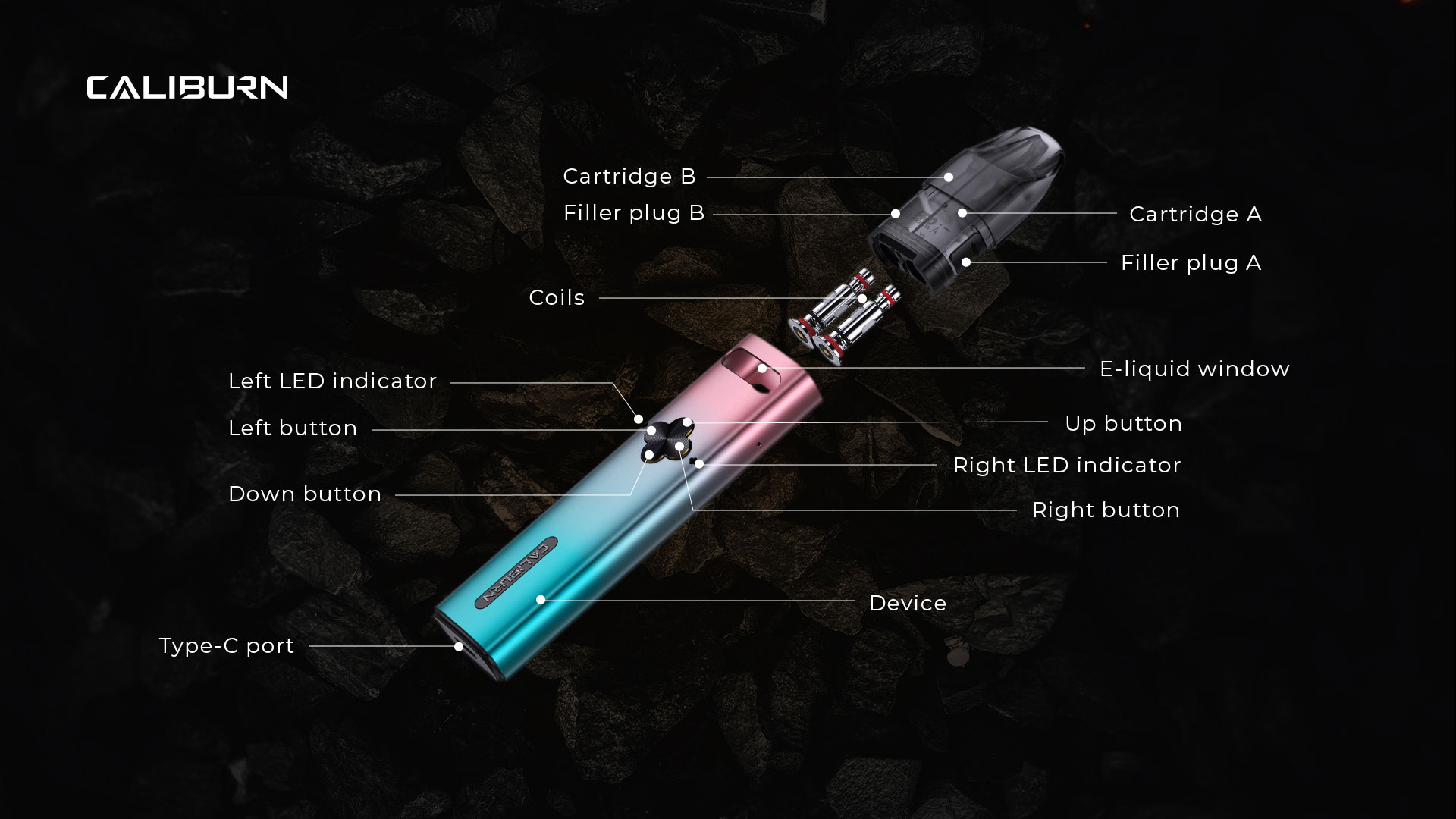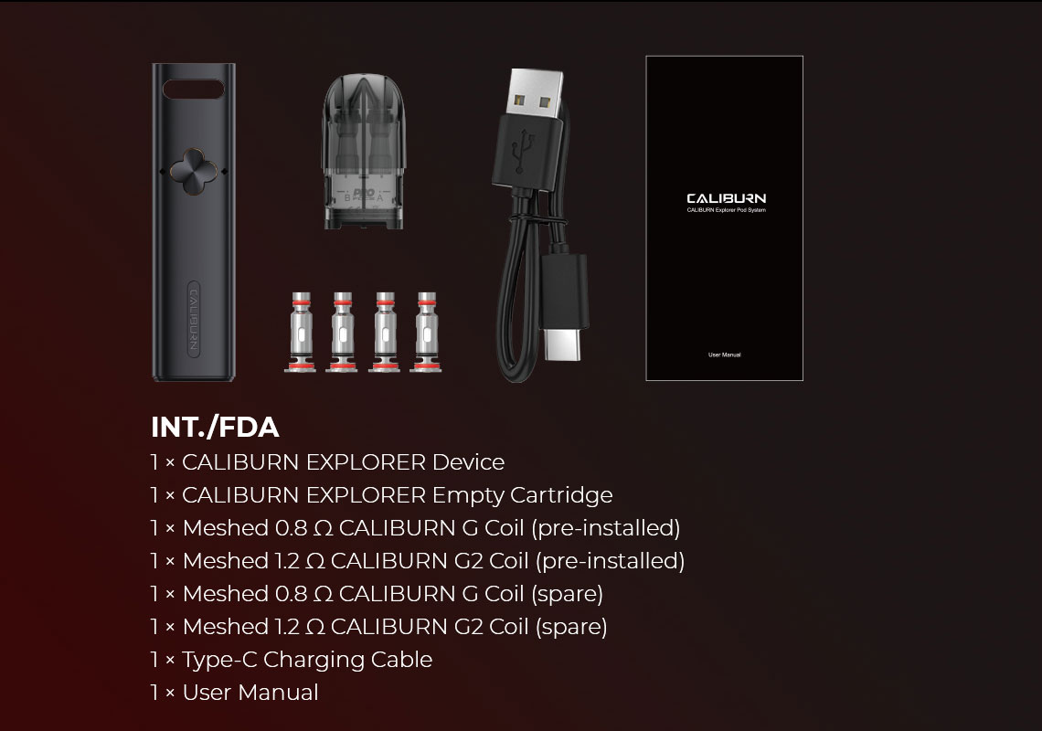 Kartuş: Uwell Caliburn Explorer Pod Kartuş, Uwell Caliburn G 0.8 Ohm coil ve Uwell Caliburn G2 1.2 Ohm coil olmak üzere önceden yerleştirilmiş iki değiştirilebilir coil kullanır. Kartuşun kendisi, her biri kendi doldurma bölmesine ve coiline sahip iki ayrı kartuş olarak kullanımına olanak sağlamak için ortadan bölünmüştür.