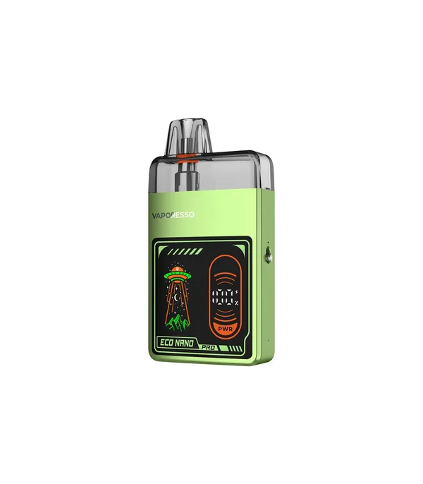 Vaporesso Eco Nano Pro Pod Mod yeşil, uzaylı desenli, kompakt elektronik sigara cihazı.