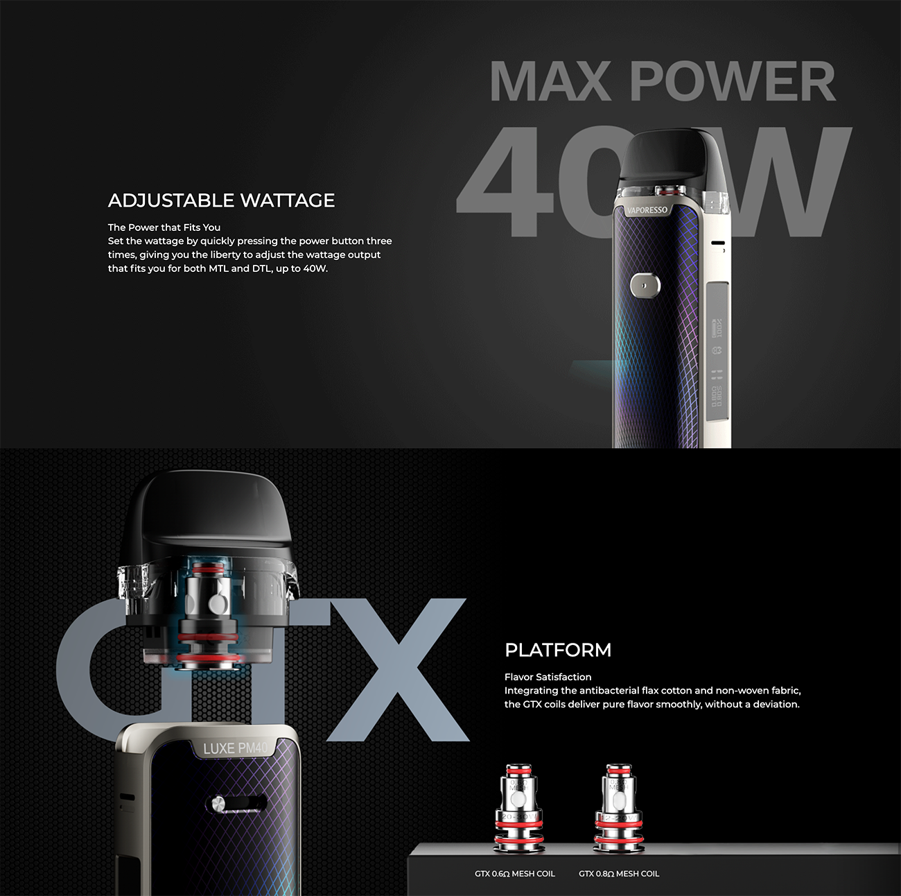 Vaporesso Luxe PM40, 1800 mAh kapasiteli dahili bir bataryaya sahiptir ve 5-40 watt aralığında ayarlanabilir çıkış gücü sunar.