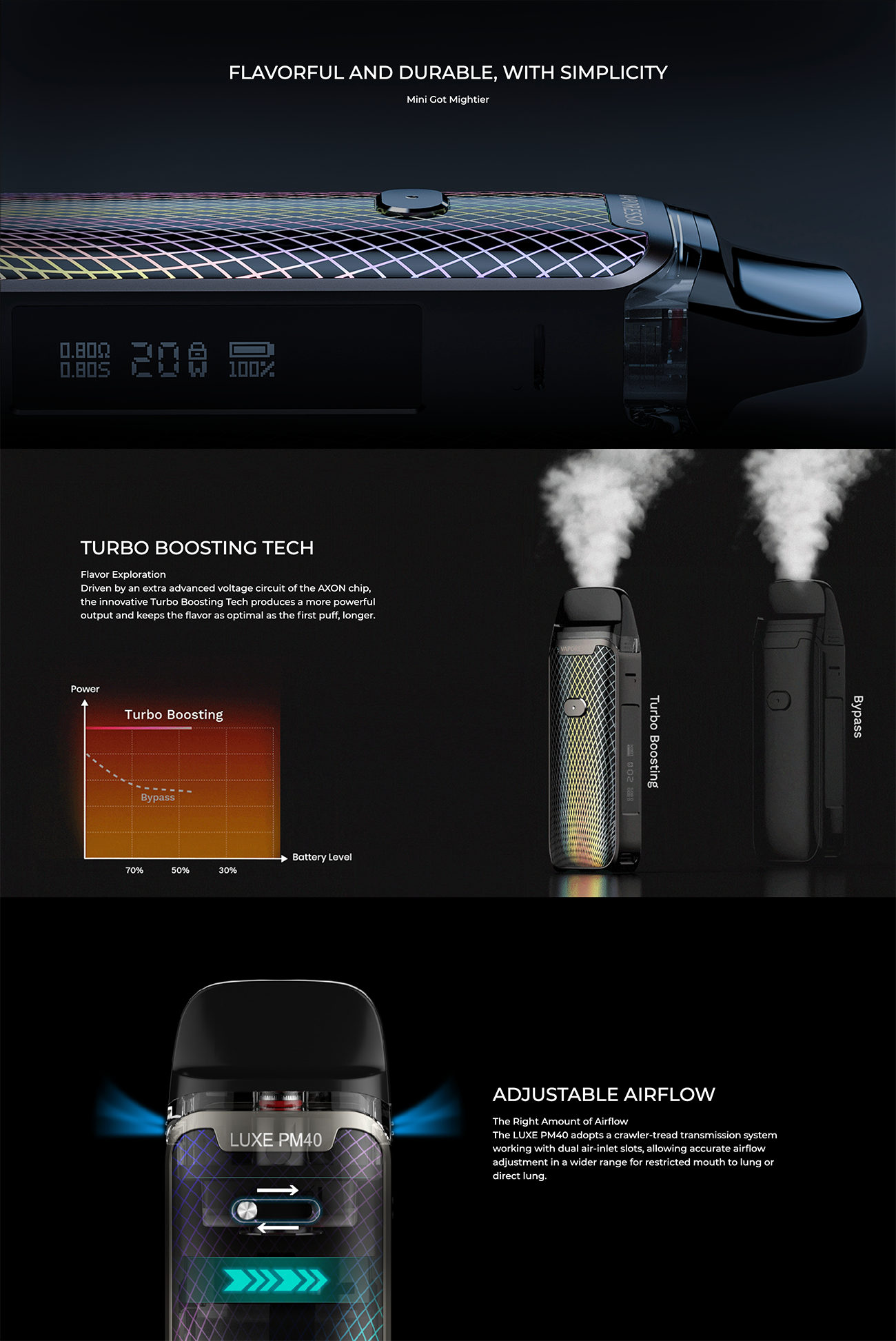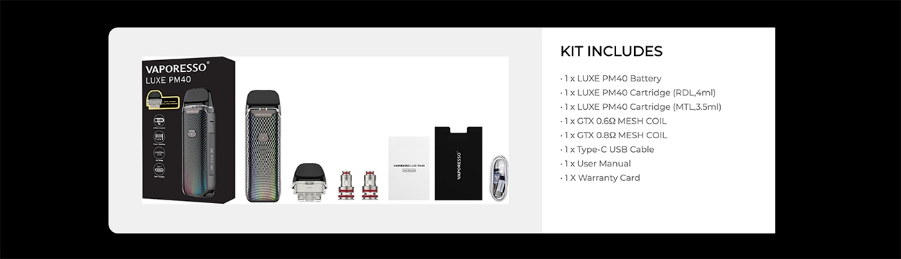 Vaporesso Luxe PM40, 1800 mAh kapasiteli dahili bir bataryaya sahip olan ve 5-40 watt aralığında ayarlanabilir çıkış gücü sunan kompakt bir pod mod cihazıdır. Üstten kolayca doldurulabilen 4 ml kartuş kapasitesi ile kullanıcıya pratiklik sağlar. Cihaz, Turbo Boost teknolojisi sayesinde sabit bir buhar deneyimi sunarken, ayarlanabilir watt ve hava akışı ile kişisel tercihlere göre özelleştirilebilir.