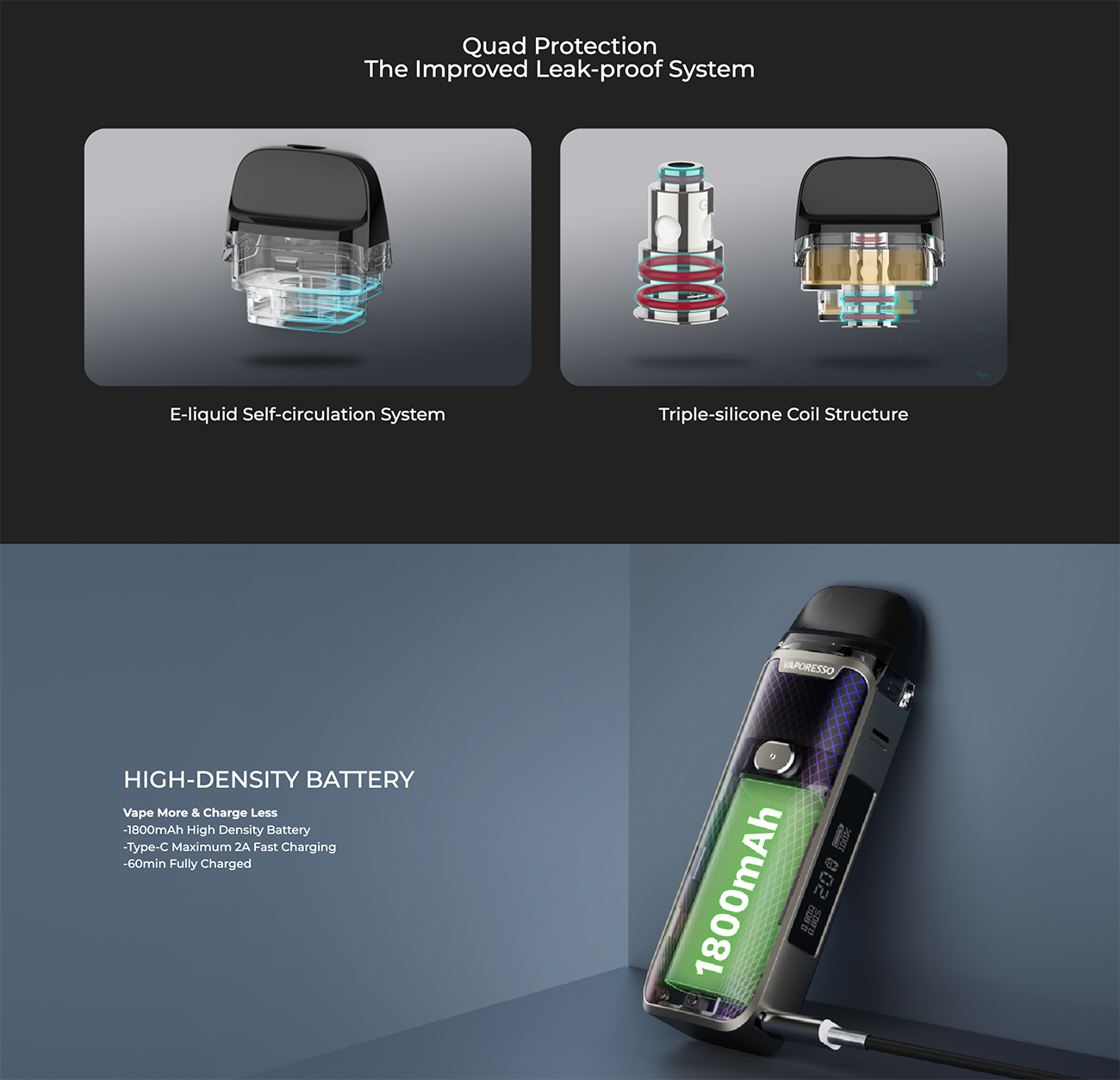 Vaporesso Eco Nano Pod Mod, güçlü 1000mAh bataryası ile uzun kullanım süresi sunar ve 16W maksimum çıkış gücü ile ağızdan akciğere (MTL) içim için ideal miktarda buhar üretir.